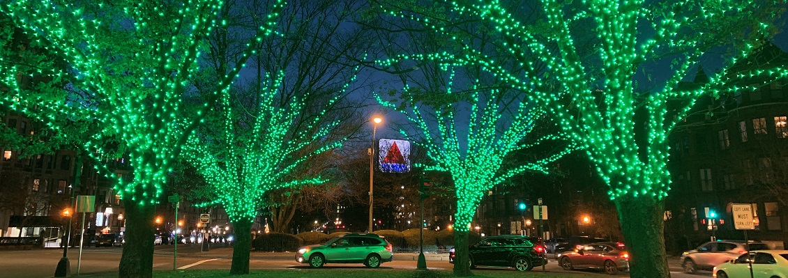 This winter, the trees on Commonwealth Avenue at Charlesgate Park are shining emerald green to spotlight the intersection of the Emerald Necklace and Commonwealth Avenue Mall!