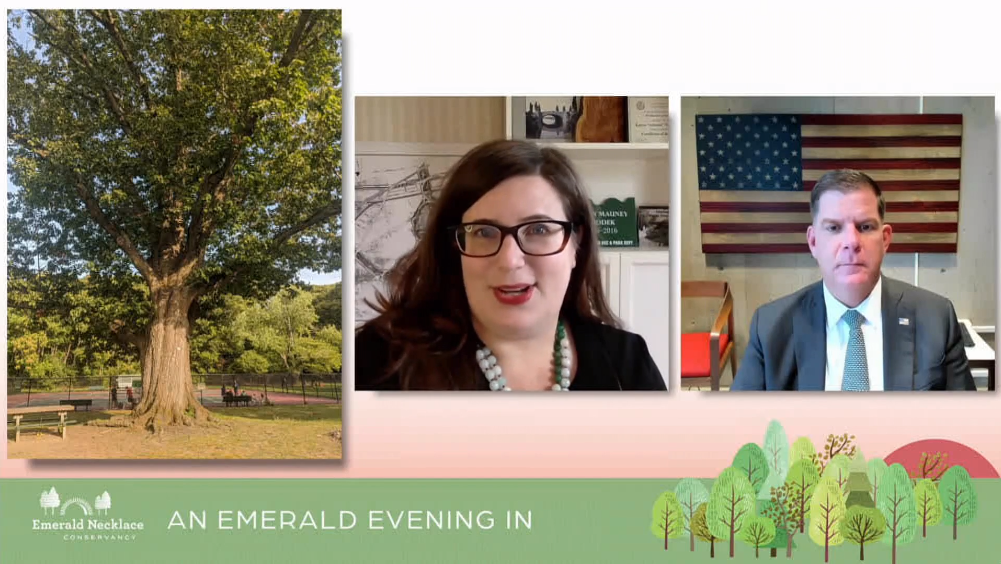 This year’s Emerald Evening took place virtually – An Emerald Evening In. Guests were treated to a networking cocktail reception and an exciting program highlighting the work of the Emerald Necklace Conservancy and the vital role parks play in our lives – as green infrastructure, vibrant public spaces and essential elements of healthy living. We recognized City of Boston Mayor Martin J. Walsh with the Olmsted Award of Excellence for his administration’s significant capital investments in the Emerald Necklace and invited participants to delve into park topics such as caring for an urban tree canopy, green infrastructure and spatial justice. The evening also featured a raffle, trivia questions, a special musical performance and a custom meal curated by local businesses Curds & Co. and The Urban Grape.